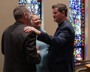 Father Tim Nunez shares his delight in Caprani’s new position with both her and Bishop Holcomb. | Photo: STEPHANIE GAMBLE PHOTOGRAPHY
