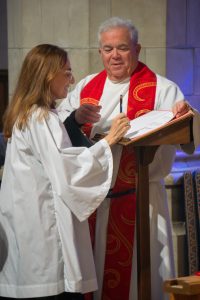 Adams and Springmann agree. “Overall, the ordination service was a pivotal moment in my life,” Adams said. “It represented a point in time where a journey officially came to an end, and, at the same time, a brand-new journey opened up ahead of me. The most meaningful parts of the service for me were the laying on of hands from Bishop Holcomb, being vested by my family and distributing Communion at the Cathedral. In each of these moments, I felt this transition into a new vocation coming to fruition.