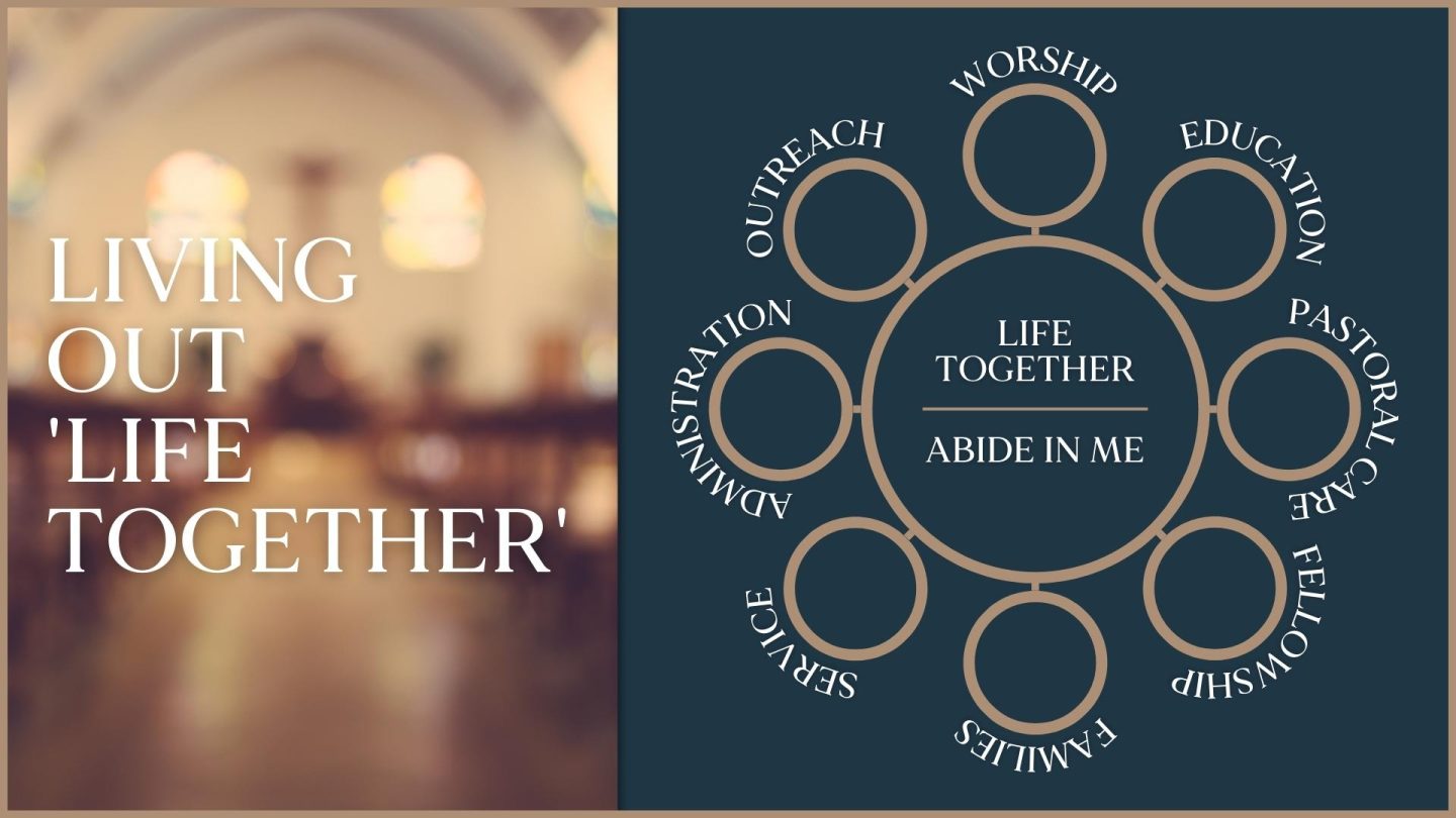 As we consider how this approach could transform our life with God within our parishes, perhaps a visual image will help. Imagine a circle with the words “life together” and “Abide in me” in the center, and begin praying for those words to come alive for you and your community. Next, extend out from the circle several spokes, each one representing a vital component of how the parish experiences life together. The first spoke is worship, and the others represent education, pastoral care, service to the church, fellowship, outreach, administration and so forth.