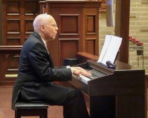 Sixty to 70 people attended the free event, which featured improvisations by Hurd and the CFAGO Tribute Choir and a sing-along with the audience and the choir of his recently created choral work, “When in Our Music,” along with other hymns. The 30-member choir was comprised of the Jones High School Master Singers and CFAGO members. Before each section, Hurd explained the origins of the text. He also played prelude and postlude improvisations.