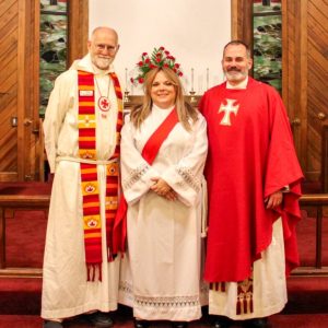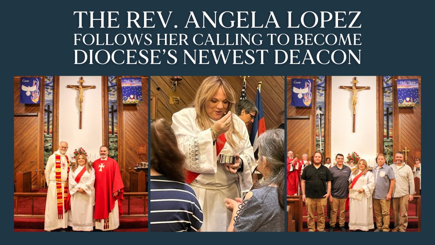 Father Tom Rutherford (L) and Bishop Justin Holcomb (R) with Deacon Angela Lopez | Photo: Katherine Reusch