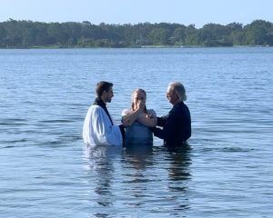 “It was definitely a moving experience,” Perreault said. “Her grandfather assisted me, the three of us walking out into the lake in order to immerse her in the waters of baptism.” The family used a phone’s video chat feature to allow family members in Texas to watch the baptism as well. Thanks to a set of machine-washable vestments, Perreault was fully vested; he went home to change to fresh robes before conducting the church’s regular Sunday-morning service.