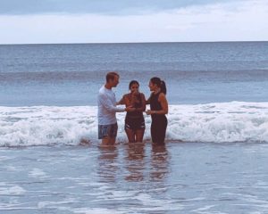 Father Peter and Mrs. Michelle Tepper baptize Giselle in the waters off Bethune Beach in New Smyrna Beach. | Photo: SOPHIA TEPPER